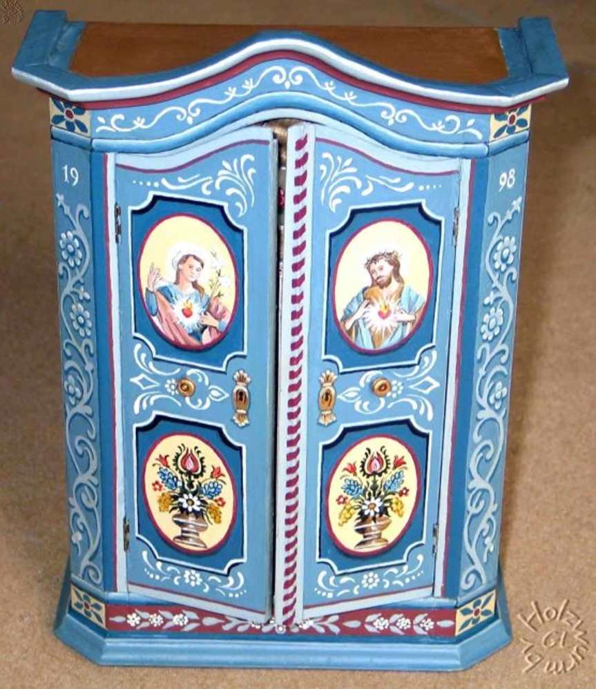 ein wunderschöner, handbemalter, bäuerlicher Holzschrank, (gekauft, nicht ganz in unserem Hobby-Maßstab, H 290 x B 210 x T 95mm) a beautiful, handpainted peasant wooden cupboard, (sold, not quite in our hoppy norm)