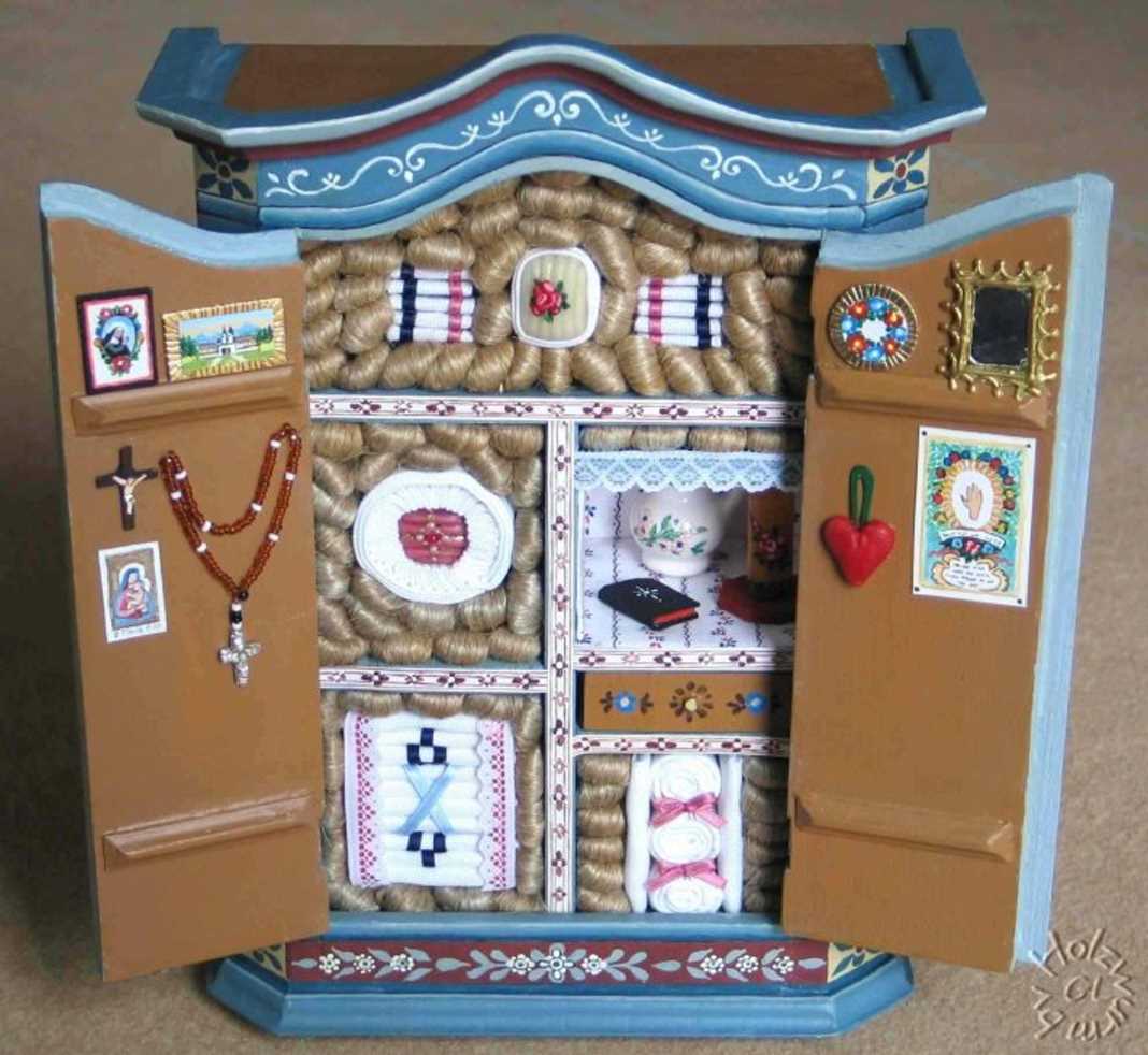 ein handbemalter, bäuerlicher Schrank (Tölzer Handarbeit) (ersteigert, nicht ganz in unserem Hobby-Maßstab, H 235 x B 215 x T 75 mm) a hand painted peasant cupboard (made in Tölz) (auctioned, not quite in our hobby norm)